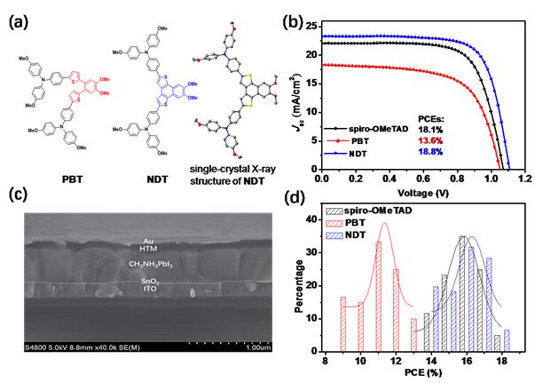 崔彬彬及其合作者設(shè)計合成了分別以“鄰二噻吩苯”和“萘并雙噻吩”為核心π-bridge的兩種低成本三芳胺類衍生物PBT和NDT(圖1a),并將在這兩種Donor-π-Donor構(gòu)型的有機小分子作為空穴傳輸層材料應(yīng)用于鈣鈦礦太陽能電池器件(圖1c)中。以基于spiro-OMeTAD分子的PSCs器件(最優(yōu)PCE:18.1%,Reverse)為參照,在同樣條件下,基于PBT的PSCs器件達(dá)到的最大光電轉(zhuǎn)換效率為13.6%,而以相對于PBT具有更好平面共軛特征的NDT作為空穴傳輸層的PSCs器件最優(yōu)光電轉(zhuǎn)換效率可達(dá)到18.8%(圖1b)。