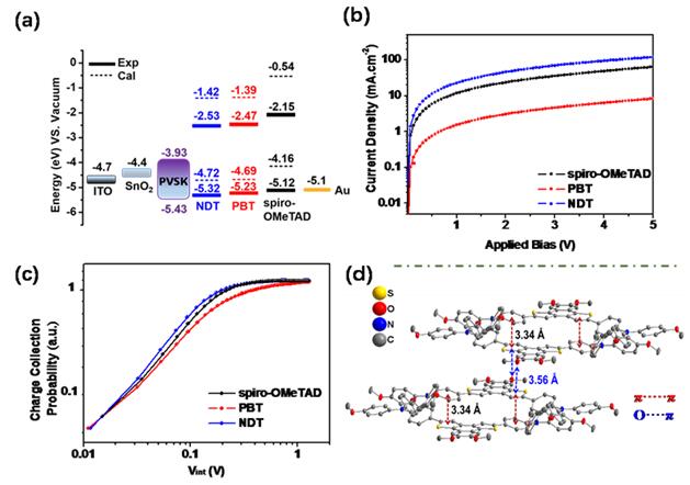 圖2(a)三種有機分子的能級分布和與PVSK的匹配程度;(b)“SCLC”法測試有機分子的空穴遷移率;(c)三種有機分子的電荷收集概率PC;(d)NDT分子晶體結(jié)構(gòu)中的π-π堆積和O-π堆積。