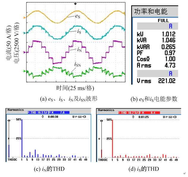 圖15(a)從上至下依次為系統(tǒng)網(wǎng)側(cè)電壓eS、NLM單元和PWM單元輸出電流疊加后的網(wǎng)側(cè)電流iS、NLM單元輸出電流iN和PWM單元輸出的補(bǔ)償波形iSN。圖15(b)為網(wǎng)側(cè)電能參數(shù),功率因數(shù)為0.97,基本實(shí)現(xiàn)了單位功率因數(shù)。圖15(c)為iN的THD,由于實(shí)驗(yàn)只采用2個(gè)H橋級(jí)聯(lián)的NLM單元,其THD較大,達(dá)到了16.5%。圖15(d)為iS的THD圖,經(jīng)過PWM單元的諧波補(bǔ)償作用,不僅使iS實(shí)現(xiàn)了正弦化,而且THD降為10.7%,效果顯著。