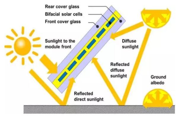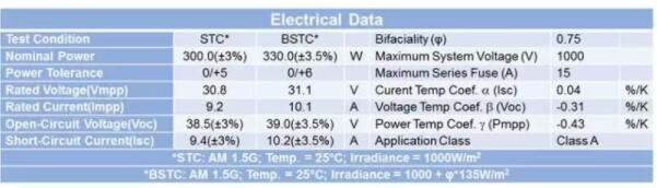 對(duì)于單面組件而言,定價(jià)的最重要的參考依據(jù)目前依然是標(biāo)準(zhǔn)測(cè)試條件(STC:組件溫度25ºC,入射輻照度1000 W/sqm,光譜分布為AM1.5G)下的功率標(biāo)定。而對(duì)于雙面組件的電性能測(cè)量,我們?cè)诨赟TC所作假設(shè)的基礎(chǔ)上增加雙面組件以37° 的傾斜角度和1米的離地高度安裝時(shí)的條件,由此確立了雙面標(biāo)準(zhǔn)測(cè)試條件(BSTC)。