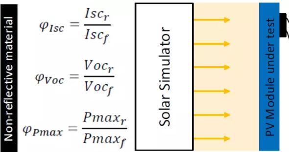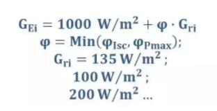 TÜV萊茵內(nèi)部標(biāo)準(zhǔn)2PfG 2645/11.17 中規(guī)定可以使用IEC 60904-1-2中的單面輻照和雙面輻照測(cè)試方法,不過目前在TÜV萊茵的實(shí)驗(yàn)室中使用的是單面輻照測(cè)試方法。除了BSTC下的測(cè)試,背面輻照度 (Gri) 為100W/sqm 和 200 W/sqm 時(shí)的IV測(cè)試結(jié)果也可以作為補(bǔ)充信息在測(cè)試報(bào)告中提供。 如下圖所示,單面輻照測(cè)試方法首先對(duì)雙面組件正反兩面分別在STC條件下進(jìn)行功率測(cè)試,然后再測(cè)試組件正面在等效輻照度(GEi)下的光伏特性。等效輻照度(GEi)由以下公式計(jì)算得出:
