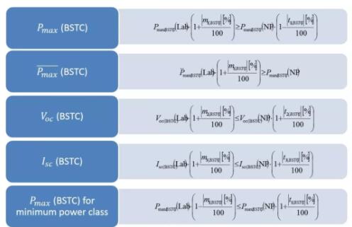 根據(jù)國際標(biāo)準(zhǔn)IEC 61215:2016的規(guī)定,光伏組件在進(jìn)行任何進(jìn)一步的測(cè)試之前都必須先穩(wěn)定其電性能。對(duì)于雙面組件,光致衰減(LID)等問題依然存在并且不可忽視。因此,TÜV 萊茵2PfG 2645/11.17 建立了一套對(duì)BSTC下測(cè)得的光伏數(shù)據(jù)進(jìn)行銘牌驗(yàn)證的體系,該體系對(duì)于Pmax、Pmax 的平均值、 Voc 以及 Isc 的判定要求和 IEC 61215-1:2016中的一致。 并且該體系中增加了對(duì)于最低功率檔組件在BSTC下的 Pmax 的額外要求來保證最低功率檔組件的質(zhì)量。具體要求如下: